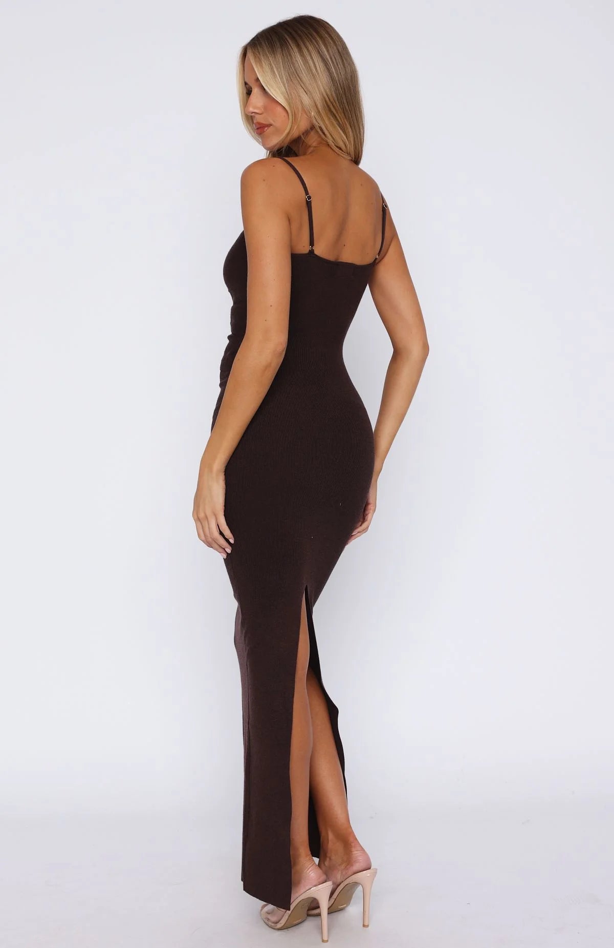 Elevate your spring/autumn wardrobe with the Break It Off Maxi Dress Espresso. Features a plunge neckline, front cu-out design with metallic detailing, thin adjustable straps, soft and high stretch knit fabric, maxi length and unlined. Pair with a thong heel and fresh tan for a fit ready for a long summers night!