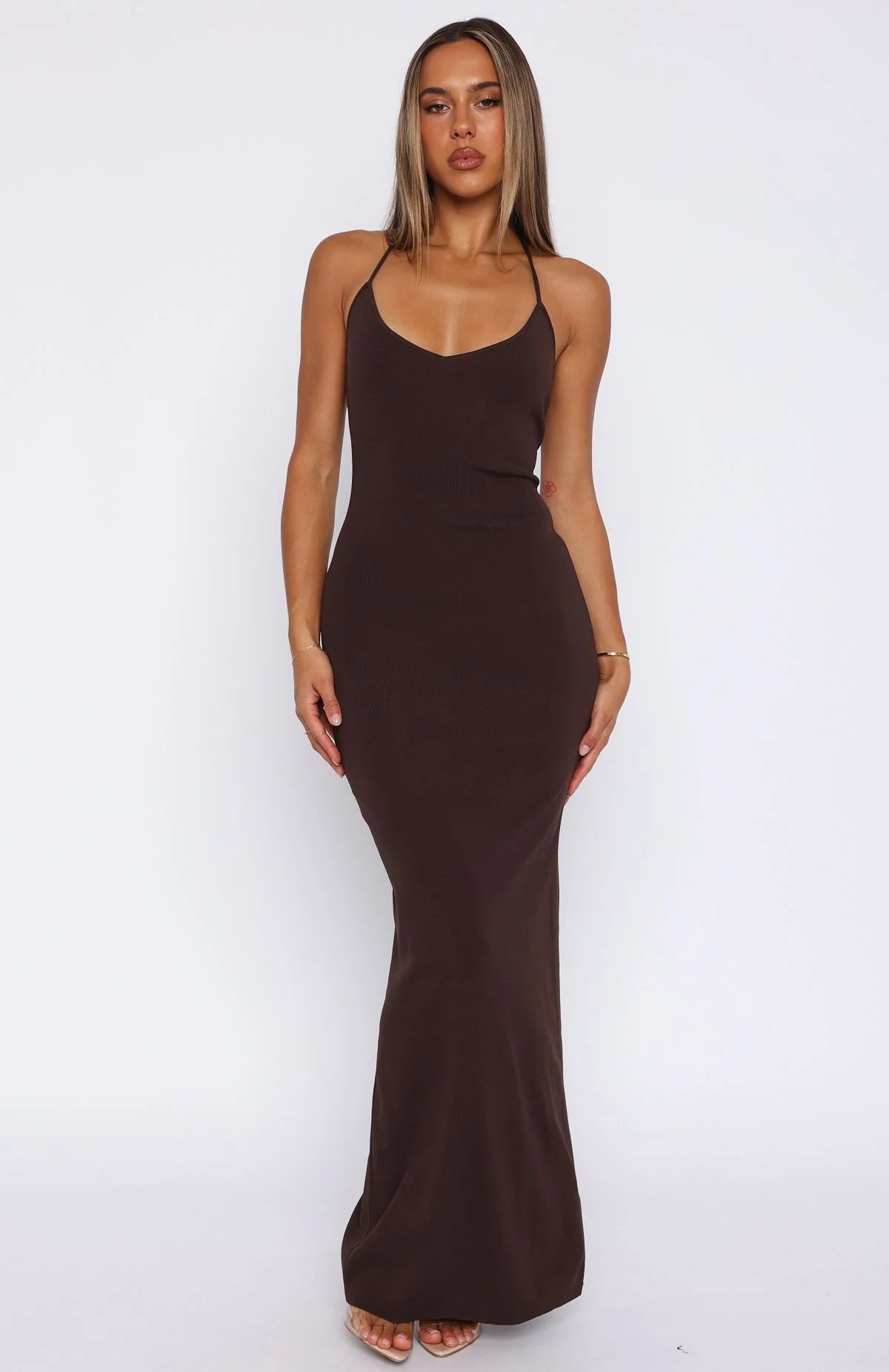 Create a jaw dropping entrance in the Don't Need Permission Maxi Dress Chocolate! Features scoop neckline, halter, hugging fit, beading detail on back straps, adjustable back straps, low back and back leg split. Take this fit one step further by styling it with wedges and gold accessories for a look we love.