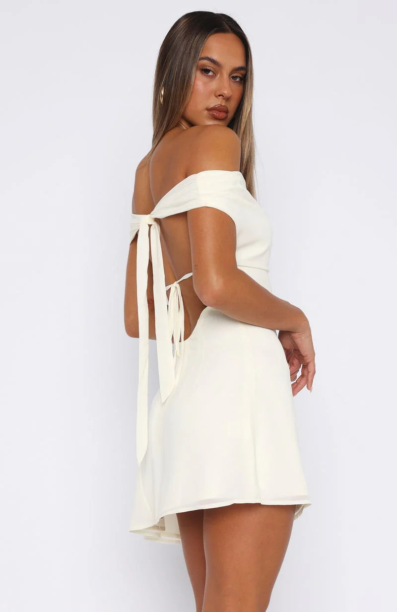 Feel your most elegant in the High Horse Mini Dress in Off White! Features strapless neckline with self tie thick shoulder straps closing centre back, fitted waistband for a cinched look, additional back self tie straps for bust support and invisible zipper with hook and eye closure on side. Simplistic styling is key here with kitten heels and gold jewellery!