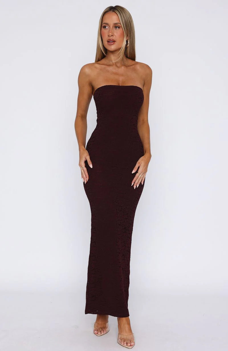 Fall madly in love with the Mad Love Strapless Maxi Dress in Burgundy! Features strapless neckline with grip tape, figure hugging design, lined, back leg split for ease of walkability and invisible zipper with hook and eye closure centre back. Complete the look with clear heels and simplistic jewellery for a sexy date night fit!