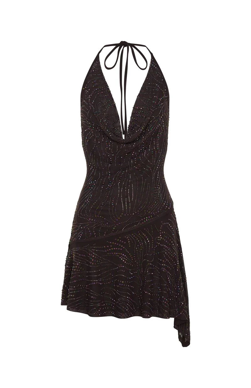 Ready to light up the night in the Wild Devotion Embellished Mini Dress in Chocolate. Features thin halter straps, a draped cowl neckline, an asymmetric hem, shimmering diamante embellishments, a bold backless design and a fully lined finish. Style it with sleek heels and a statement bag, and let this glittering moment take over.